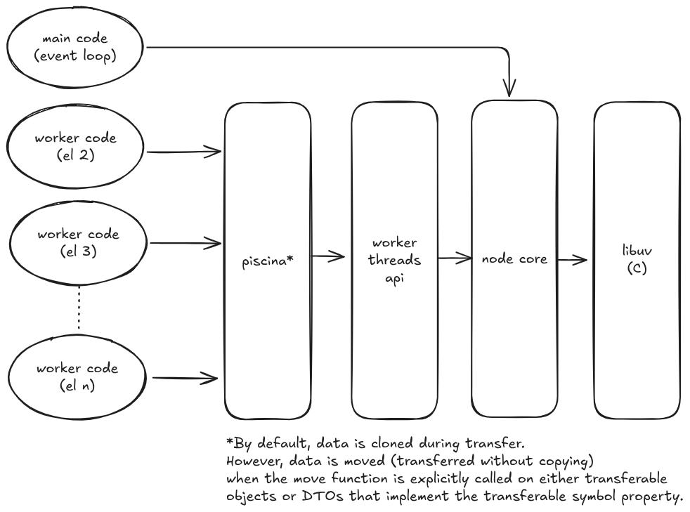 Piscina is a library in between the user code and the libuv library. By default all payload passed to piscina are copied unless the move function is explicit used.